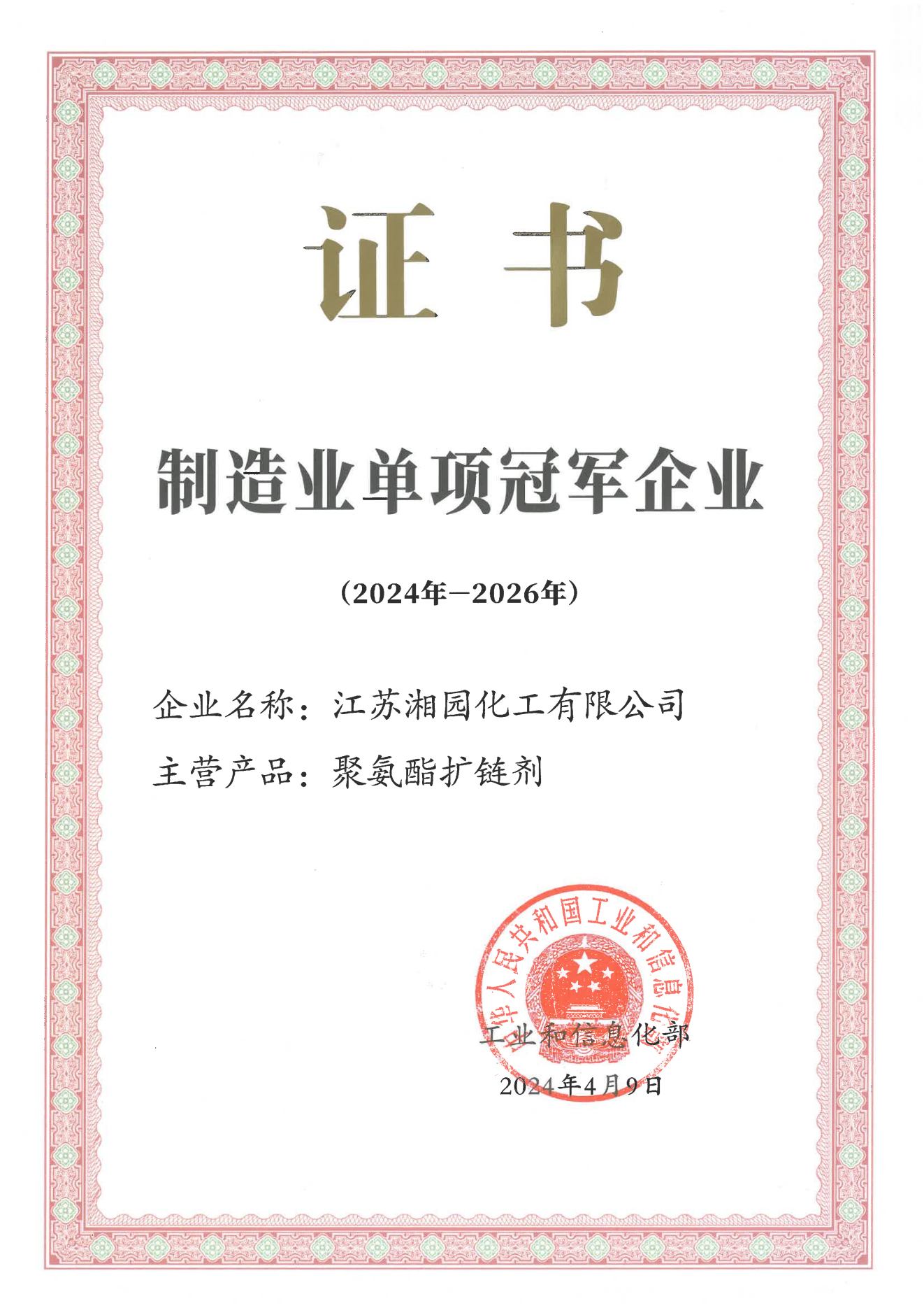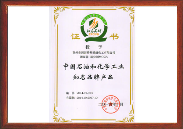 “湘園牌”聚氨酯橡膠硫化劑MOCA被授予中國石油和化學工業聯合會知名品牌産品